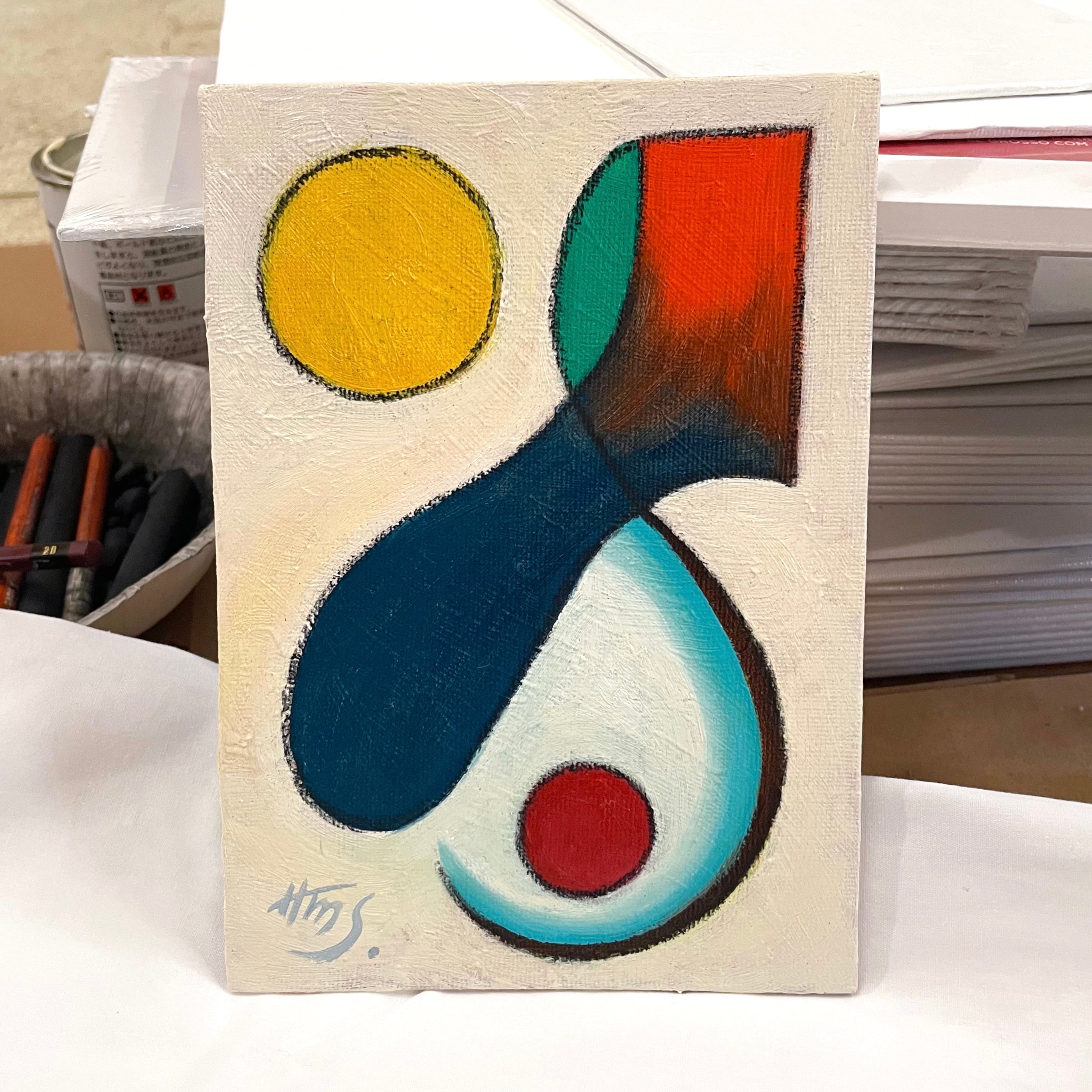 木製のミニイーゼルに作品を立てかけて気軽に飾ることができます。裏面にサイン入り。