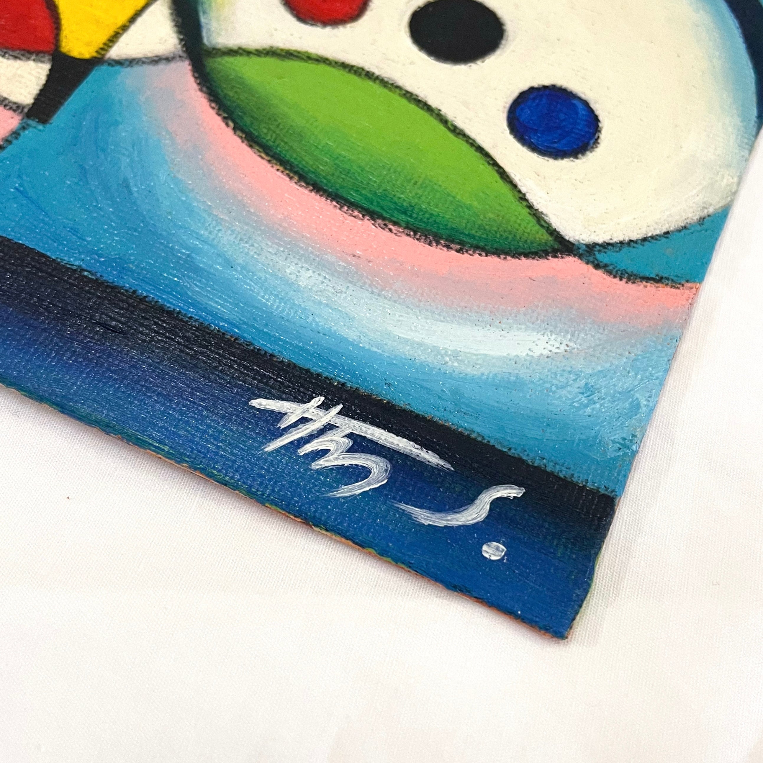 木製のミニイーゼルに作品を立てかけて気軽に飾ることができます。裏面にサイン入り。